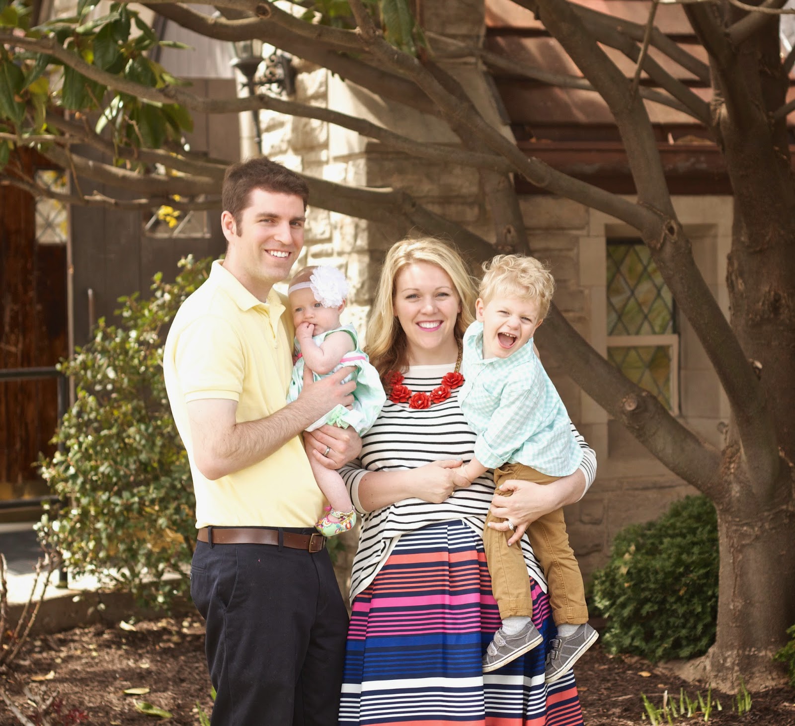 {Our little family after Sunday morning - er, mid-day - mass. Liam being Liam - such a goofy boy these days, has us laughing and stumped most the time wearing