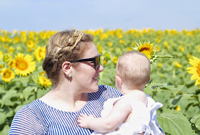 Sunday, we got out of town (a bit). We went to Lawrence, KS to visit our alma mater, eat at my favorite restaurant and show Nora around (her first trip!). On the way, we stopped at the Grinter Farm where lives a sea of sunflowers. Seriously, it's breathtaking. They are just the happiest flowers of all and to see them as tall as you, straining to face the sun in full bloom just brings a smile to your face! Liam loved running down the rows and hiding between the stocks. I had to keep a close eye on him so he wouldn't get lost in the leaves! And Nora, she was just in awe! She reached out for every nearby sunflower to gently touch. She is always so sweet and tender, this field was perfect for her.